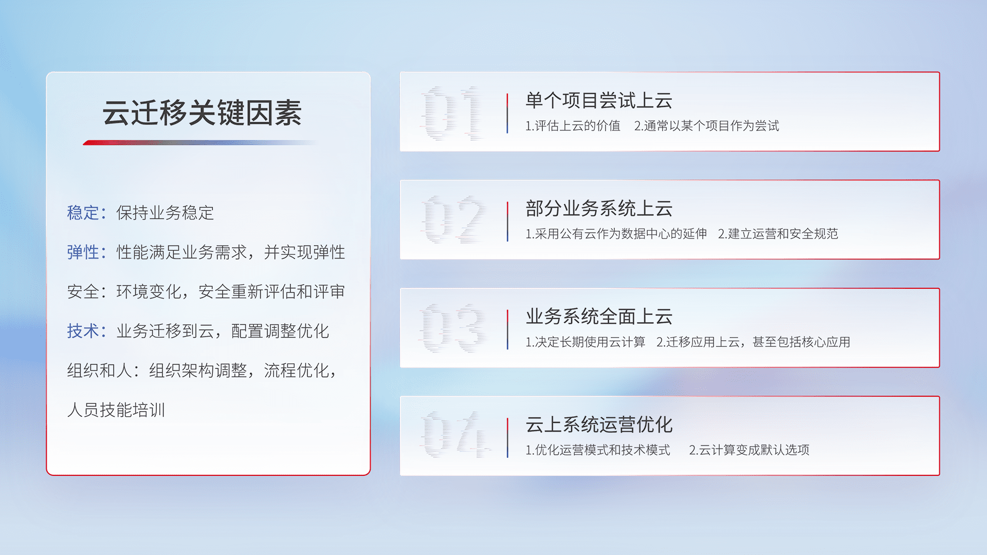 结合实际业务,,从规划设计、、云平台选型、、、云原生改造、、、数据迁移、、、、集成交付,,,迁移全过程为客户识别最佳上云路径,,做好风险识别管理,,,设计网络架构、、、身份权限、、、安全审计合规、、操作审计、、、日志审计、、、监控告警策略、、、、多站点容灾设计等,,,,对云上基础设施进行整体规划,,提升IT治理水平,,,,以满足弹性、、、、高可用、、、、高性能的需求。。。